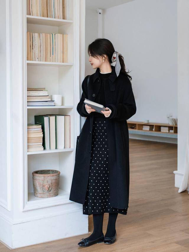 直线条设计的长款大衣,内搭修身打底,配条直筒波点裙,纵向拉长比例,显瘦显高。