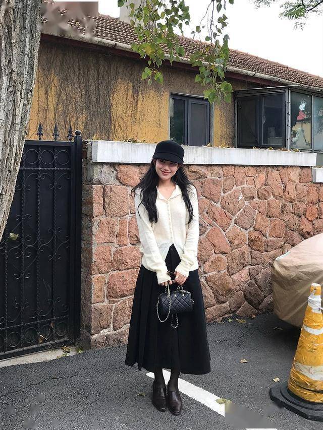 针织开衫的下摆,手动打造出“倒V”的效果”,配条高腰半身裙,用黑色丝袜勾勒脚踝轮廓,好身材穿出来。