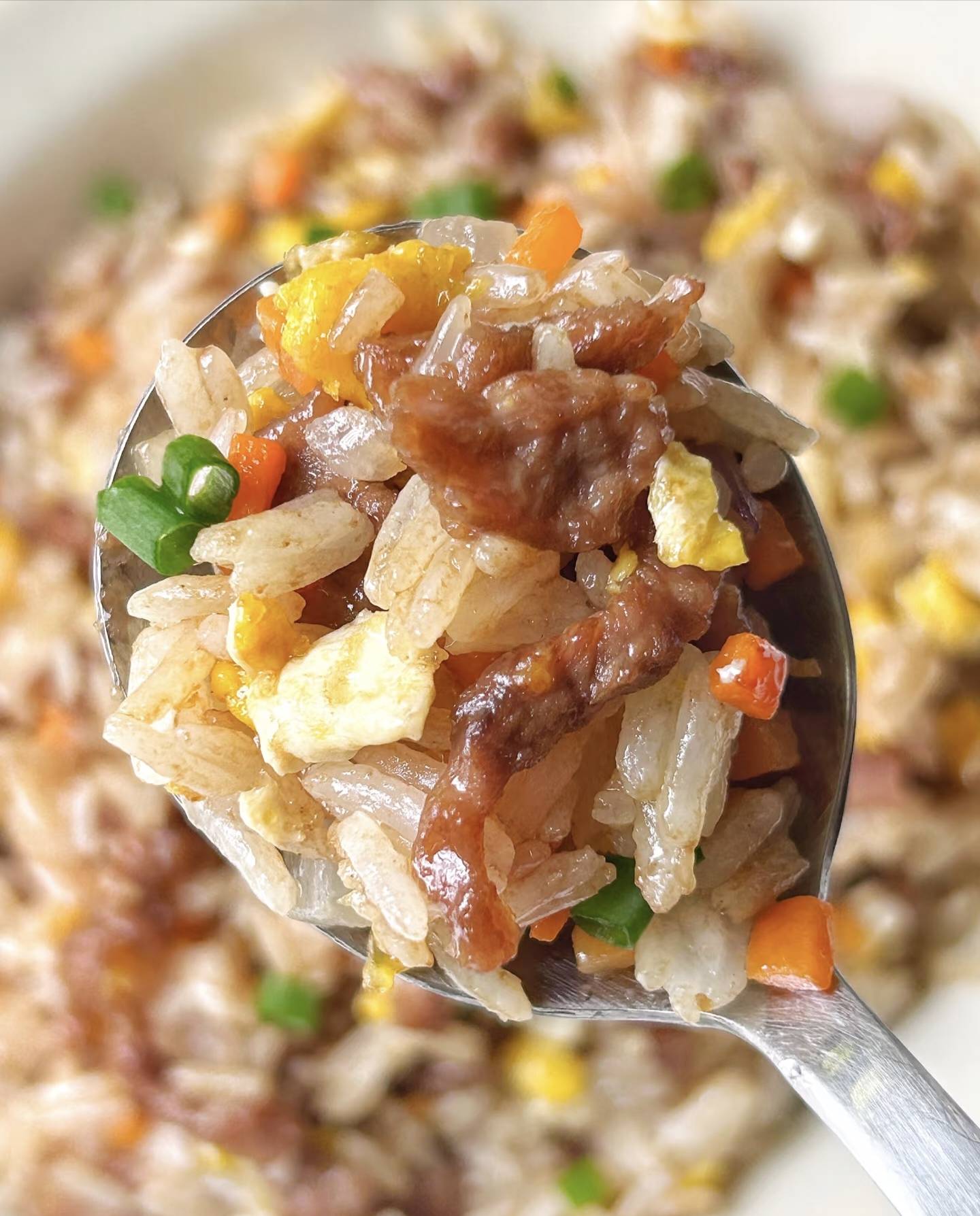 热锅凉油(油量比平时多1/3),油热后转小火倒入蛋液,待边缘凝固时用筷子快速划散(像写"米"字那样画圈), 蛋液刚凝固就盛出备用(余温会让鸡蛋继续成熟,保持嫩滑的秘诀),同一口锅补少许油,中火下洋葱丁翻炒至透明(厨房瞬间充满治愈系香气), 转大火!牛肉片平铺在洋葱上,静置10秒再翻面(让美拉德反应尽情发生),当牛肉变色卷曲时,立刻倒入米饭,用锅铲背面把饭团压散(像给米饭做按摩)。 沿锅边淋入生抽,滋滋声中激发出酱香(这是炒饭的灵魂时刻),倒入蚝油和黑胡椒碎,保持大火快速翻炒(让每粒米都裹上金色外衣)。最后放入炒好的鸡蛋,用筷子快速拨散(鸡蛋和米饭要跳贴面舞),尝一口!不够咸就撒点盐,喜欢鲜味可以滴两滴香油(但别贪心哦)。