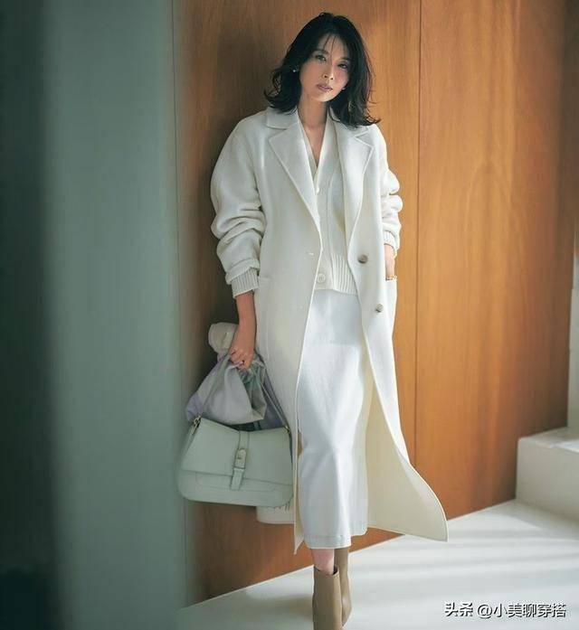 白色大衣,里面选择了白色毛衣搭配白色半裙,单一的白色搭配,带着十足的高级感,演绎出老钱风的味道。