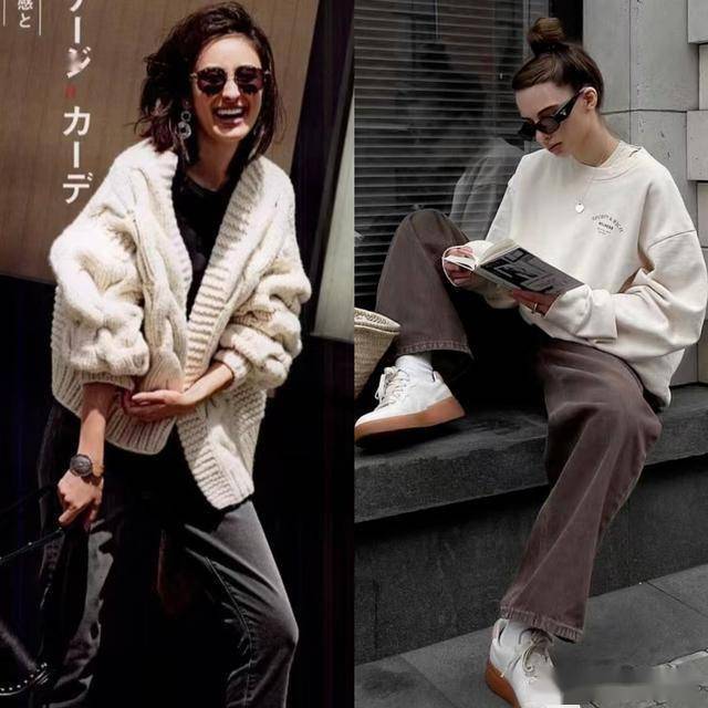 简单舒适的奶油白卫衣,配上咖色的休闲裤,配色既感觉干净清新,又带着轻松感,减龄效果更好。