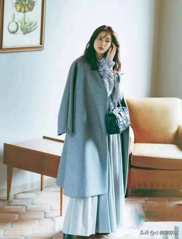 灰色的大衣,里面选择了水蓝色的衬衫与阔腿裤,配色非常干净,又带着温婉优雅的氛围感,有些静奢风的感觉。
