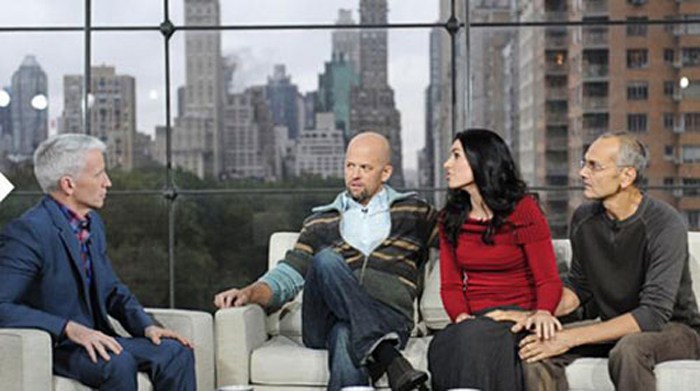 美国《Detail》杂志11月介绍三人关系后,引发大众对“一妻多夫”的讨论,三人也成为媒体追逐的对象。图为三人做客美国电视访谈节目。