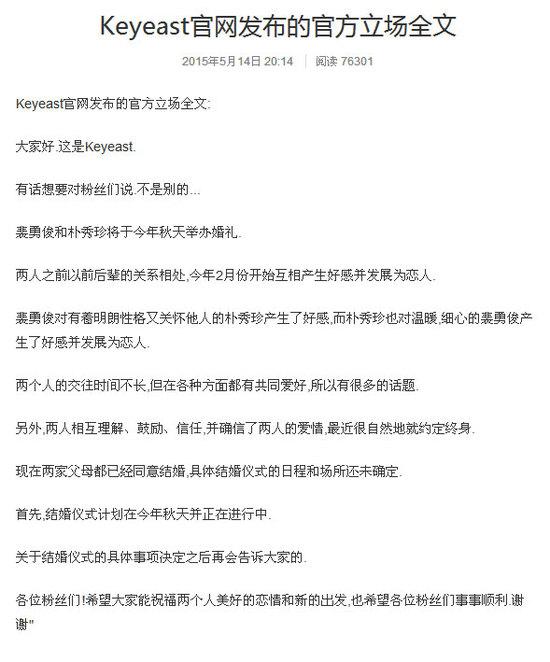 KEYEAST事务所在官网公布婚讯,指二人之前是前后辈关系,至今年2月互生好感,并慢慢发展为情侣,裴勇俊大赞朴秀珍性格开朗,而女方则欣赏男方够体贴及细心。虽然二人交往日期短,但志趣相投,是可以彼此信赖的关系,结婚一事已获得双方家长的许可,但日子及场地未定。
