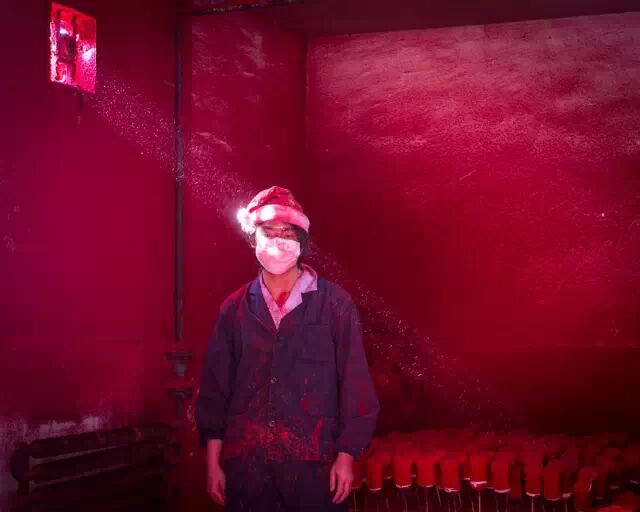 一名19岁的工人戴着圣诞老人的帽子和口罩在工厂制作圣诞节装饰,红色的粉末在空气中散布。他一天必须更换五次口罩才行。