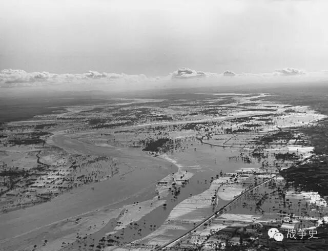 从东往西俯瞰河南洛河洪水。照片中部黑色的右斜线为郑州-洛阳铁路。图片来源:Leica Fotografie International