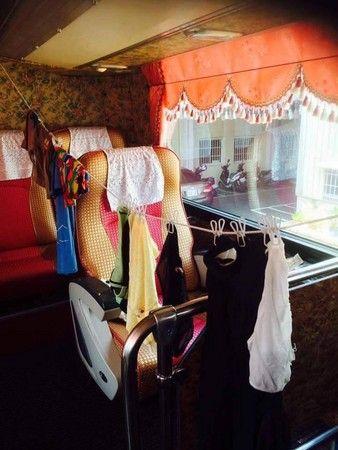 原来是大陆游客把洗好还没干的衣物,直接在游览车裡晾晒起来,上衣、裤子挂在车窗旁,内裤挂在座位后把手上,胸罩、比基尼更挂在座位前的挡板。他们还自备晒衣绳夹,俨然把整个游览车当成自己的晒衣场,一串内裤就这样晾在走道上。