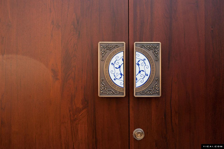 门庭所用将军门。据说是进口东南亚柚木外包铜边。把手很有特色,内嵌青花瓷板,看上去很精致。