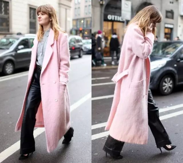 穿上这样的长大衣配上bf的灰衬衫和皮革阔腿裤,踩一双恨天高,你还会觉得粉色幼稚吗?