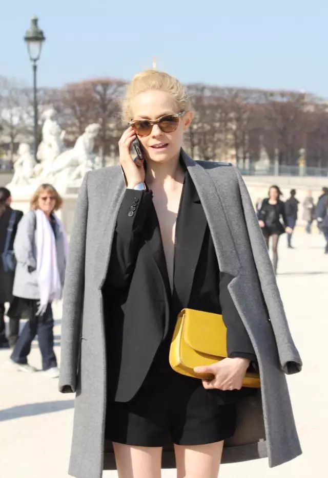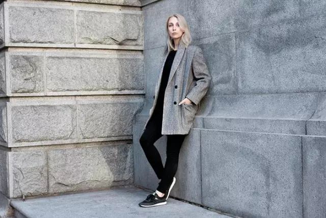 用灰色西装大衣配黑色西装,把短裤换成阔腿九分裤,一酷到底~