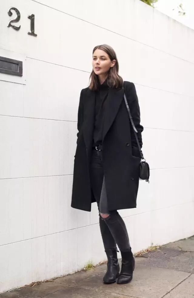 这种长度的H型大衣就配灰色的高领毛衣+牛仔裤或黑色皮裤等紧身裤